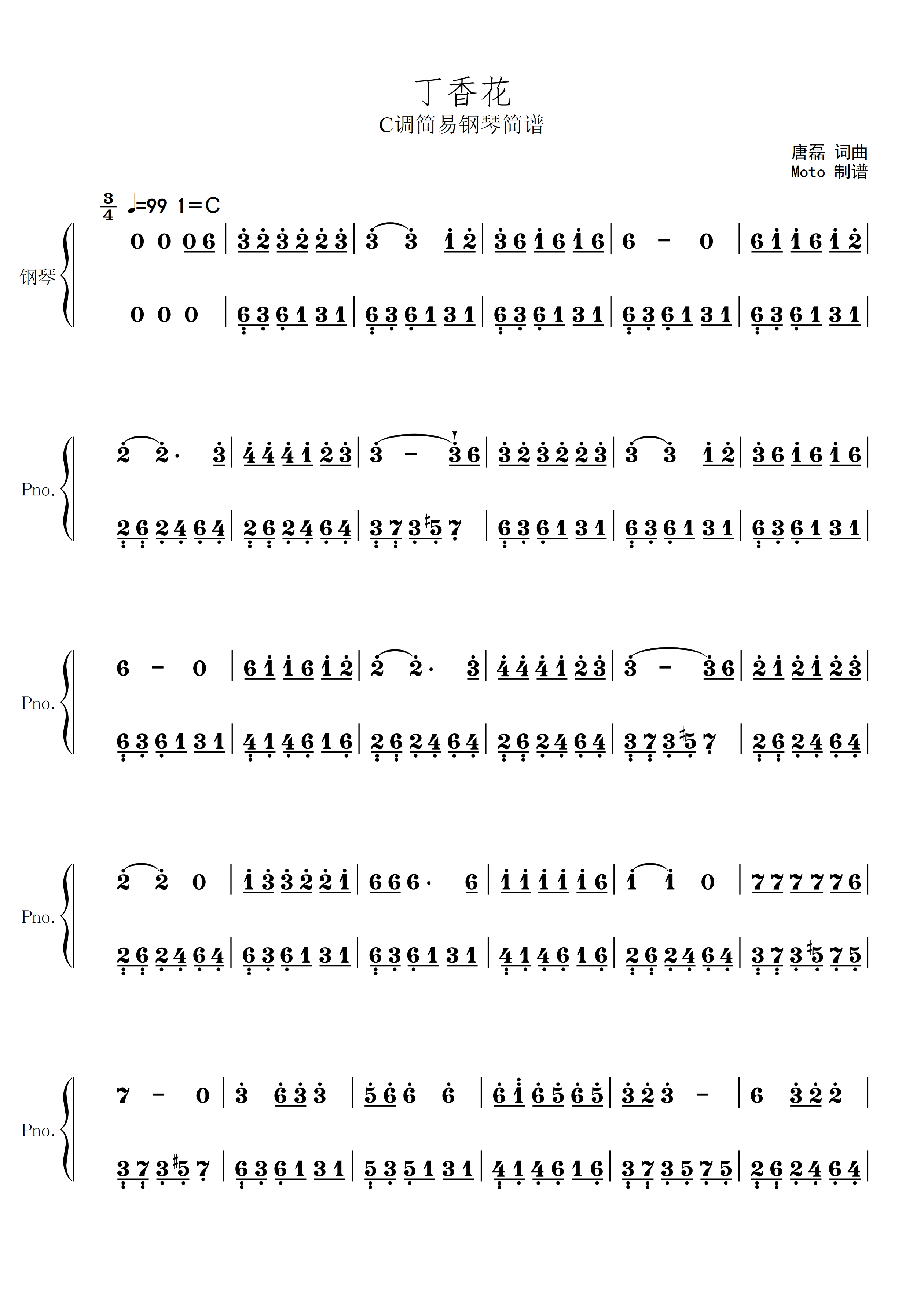 解锁《丁香花》曲谱 - C调编配 - 钢琴谱(简谱)版