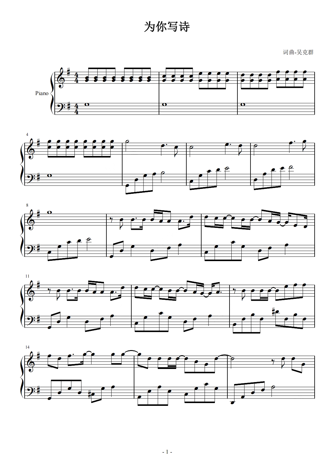 音频-《为你写诗》曲谱 - G调编配 - 钢琴谱(独奏)版