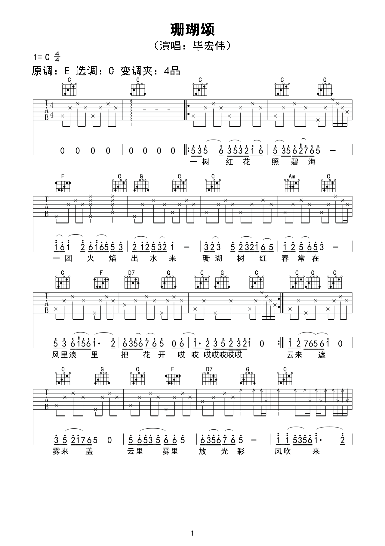 解锁《珊瑚颂》曲谱 - C调编配 - 弹唱版